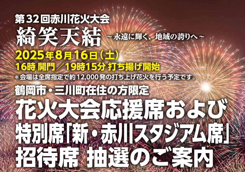 ・花火大会応援席は、鶴岡市・三川町在住の方限定で、地域の皆様に1万2000人分のチケットを抽選配布させていただきます。